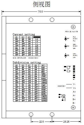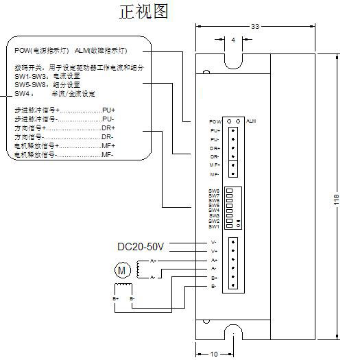 注:可根據(jù)客戶(hù)要求定制細(xì)分?jǐn)?shù)! !注意 1、輸入電壓不能超過(guò)DC50V; 2、輸入控制信號(hào)電平為+5V-+28V范圍,高于+5V時(shí)無(wú)需外接限流電阻; 3、輸入脈沖信號(hào)下降沿有效; 4、驅(qū)動(dòng)器溫度超過(guò)80度時(shí)驅(qū)動(dòng)器停止工作,故障指示燈ALM亮,直到驅(qū)動(dòng)器溫度降到50度時(shí),驅(qū)動(dòng)器需要重新上電才能恢復(fù)工作。出現(xiàn)過(guò)熱保護(hù)請(qǐng)加裝散熱器; 5、過(guò)流(負(fù)載短路)故障指示燈ALM亮,請(qǐng)檢查電機(jī)接線及其他短路故障,排除后需要重新上電恢復(fù); 6、無(wú)電機(jī)故障指示燈ALM亮,請(qǐng)檢查電機(jī)接線,排除后需要重新上電恢復(fù)。 驅(qū)動(dòng)器接線、尺寸示意圖