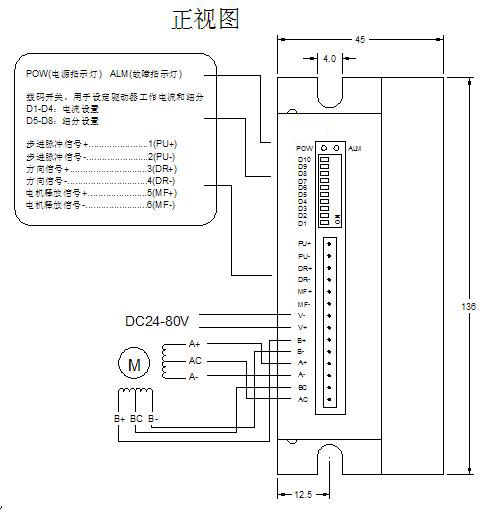 注:可根據客戶要求定制細分數! !注意 1、輸入電壓不能超過DC80V; 2、輸入控制信號電平為5V,當高于5V時需要接限流電阻; 3、輸入脈沖信號下降沿有效; 4、驅動器溫度超過80度時驅動器停止工作,故障指示燈ALM亮,直到驅動器溫度降到50度時,驅動器需要重新上電才能恢復工作。出現過熱保護請加裝散熱器; 5、過流(負載短路)故障指示燈ALM亮,請檢查電機接線及其他短路故障,排除后需要重新上電恢復; 6、無電機故障指示燈ALM亮,請檢查電機接線,排除后需要重新上電恢復。 驅動器接線、尺寸示意圖
