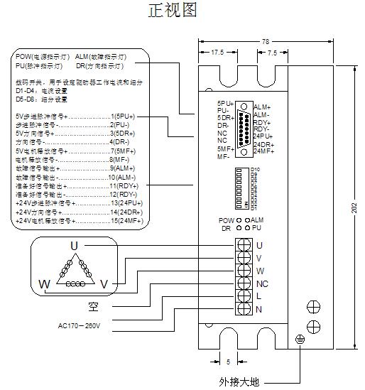 注:可根據客戶要求定制細分數! !注意 1、輸入電壓低于AC170V高于AC260V時,驅動器會自動保護; 2、輸入控制信號電平為5V,當高于5V時需要接限流電阻,驅動器自帶24V的信號接口; 3、輸入脈沖信號下降沿有效; 4、驅動器的散熱風扇在當驅動器的溫度超過48゜時才開始工作 5、驅動器溫度超過80゜度時驅動器停止工作,故障指示燈ALM亮,直到驅動器溫度降到50度時,驅動器需要重新上電才能恢復工作。出現過熱保護請加裝散熱器; 6、過流(負載短路)故障指示燈ALM亮,請檢查電機接線及其他短路故障,排除后需要重新上電恢復; 7、無電機故障指示燈ALM亮,請檢查電機接線,排除后需要重新上電恢復。 !故障現象對應(電源燈POW燈除外) 1、模塊過流:單紅燈(ALM燈)常亮 2、驅動過熱:紅燈(ALM燈)與兩綠燈(PU燈和DR燈)交替亮 3、欠壓: 紅燈(ALM燈)與DR燈同亮 4、過壓: 紅燈(ALM燈)快閃 驅動器接線、尺寸示意圖