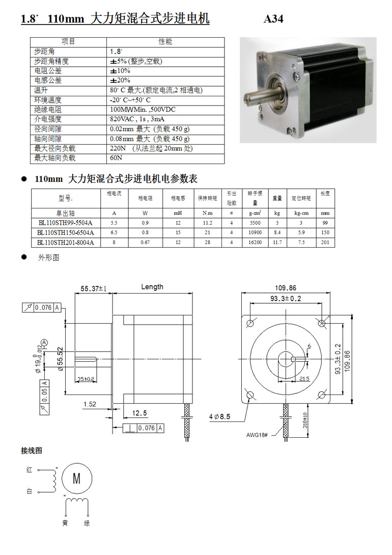 | 1.8°110mm兩相大力矩混合式步進(jìn)電機(jī) |